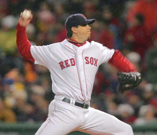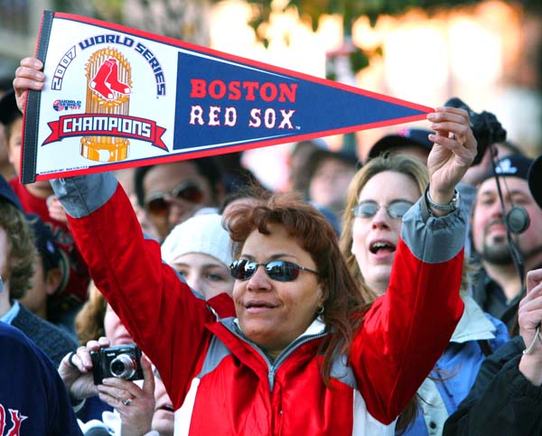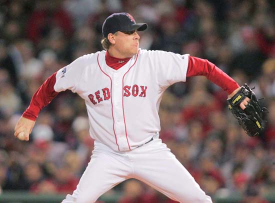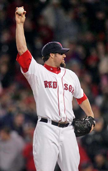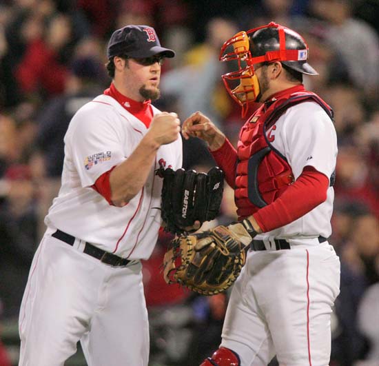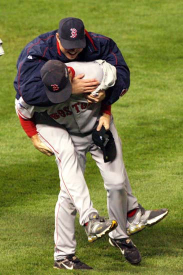Josh Beckett jumps on Dustin Pedroia's back after the Red Sox win in Game 4